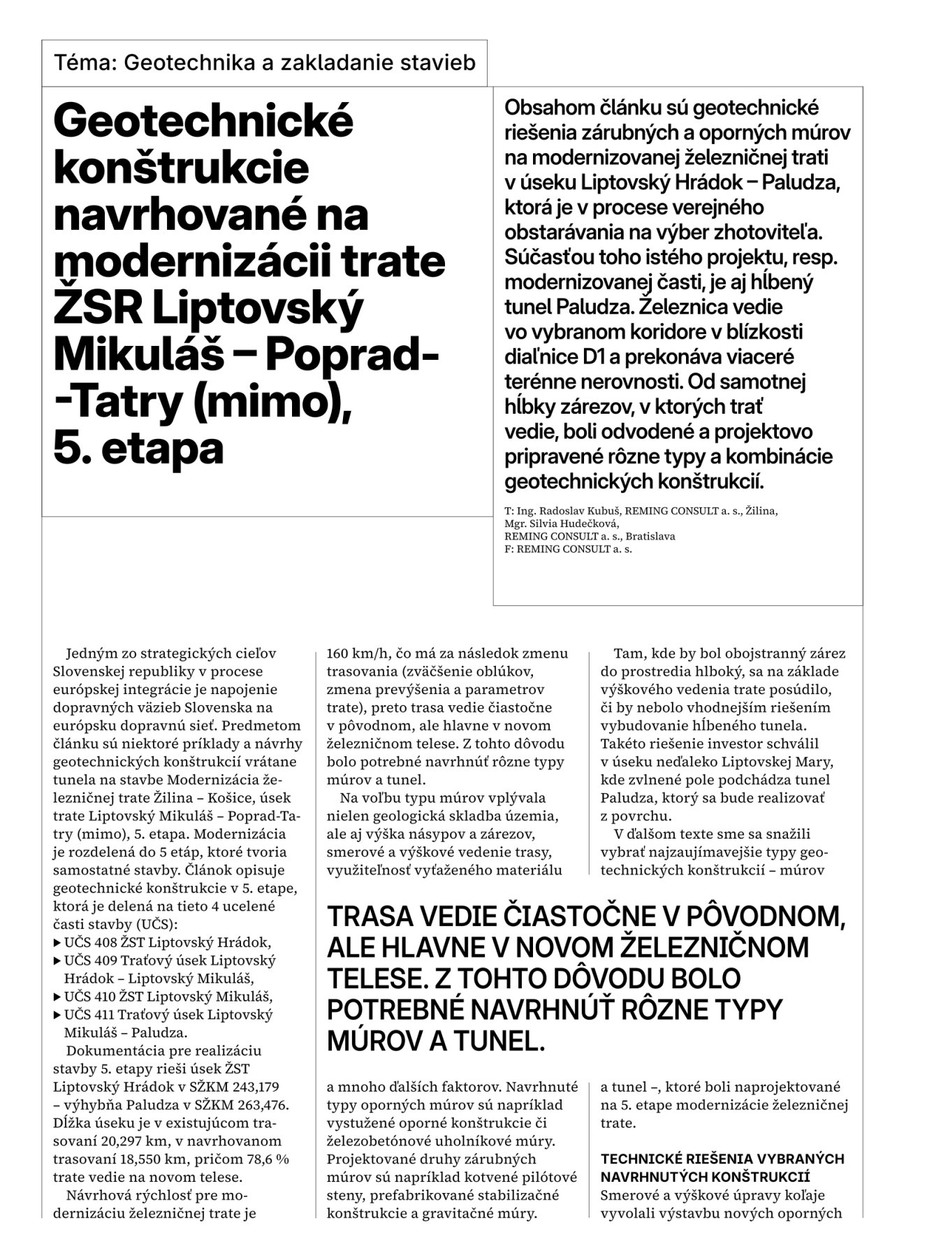 Obsahom článku sú geotechnické riešenia zárubných a oporných múrov na modernizovanej železničnej trati v úseku Liptovský Hrádok – Paludza, ktorá je v procese verejného obstarávania na výber zhotoviteľa. Súčasťou toho istého projektu, resp. modernizovanej časti, je aj hĺbený tunel Paludza. Železnica vedie vo vybranom koridore v blízkosti diaľnice D1 a prekonáva viaceré terénne nerovnosti. Od samotnej hĺbky zárezov, v ktorých trať vedie, boli odvodené a projektovo pripravené rôzne typy a kombinácie geotechnických konštrukcií.